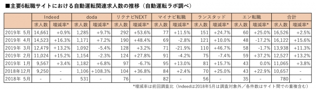 主要6転職サイト全てで増加を記録 前月比2.5%増の16,526件 - 自動運転ラボ2019.6.20
